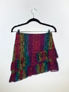 Asymmetrical tiered silk skirt. All-over rainbow snake print with feather-light ruffles. Classic Betsey!